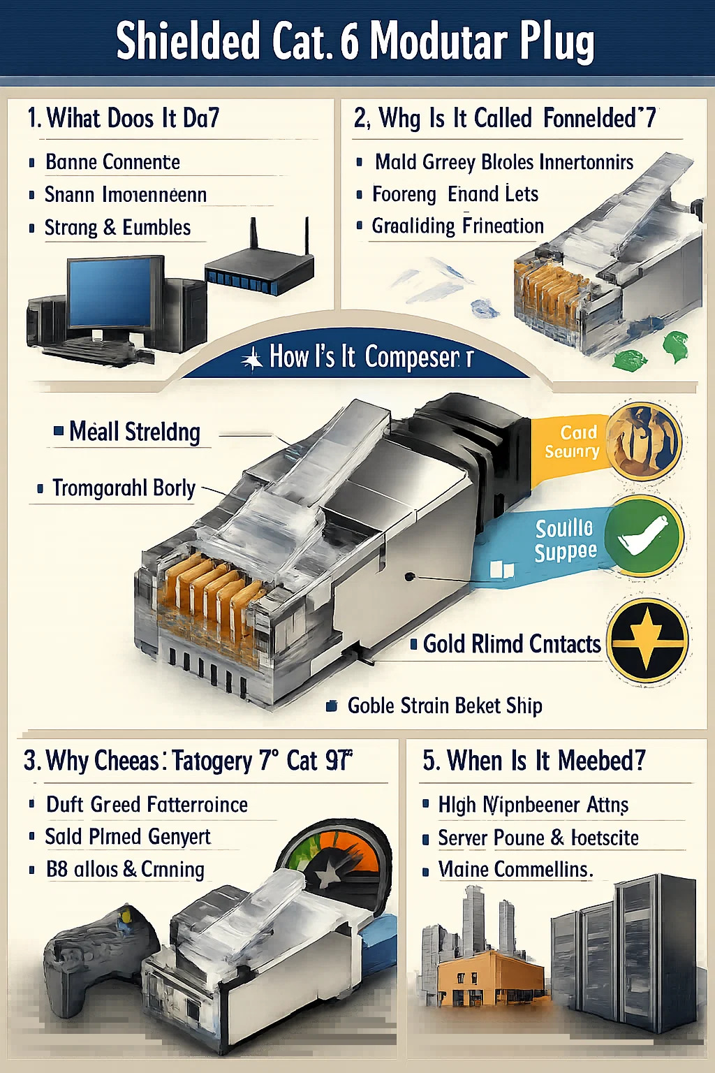 이 차폐 Cat.6 모듈형 플러그 간단히 말하면 "보호 쉴드"가 있는 네트워크 케이블 커넥터입니다. 반짝이는 금속 케이스가 있는 네트워크 케이블 커넥터를 본 적이 있다면 그게 전부입니다.