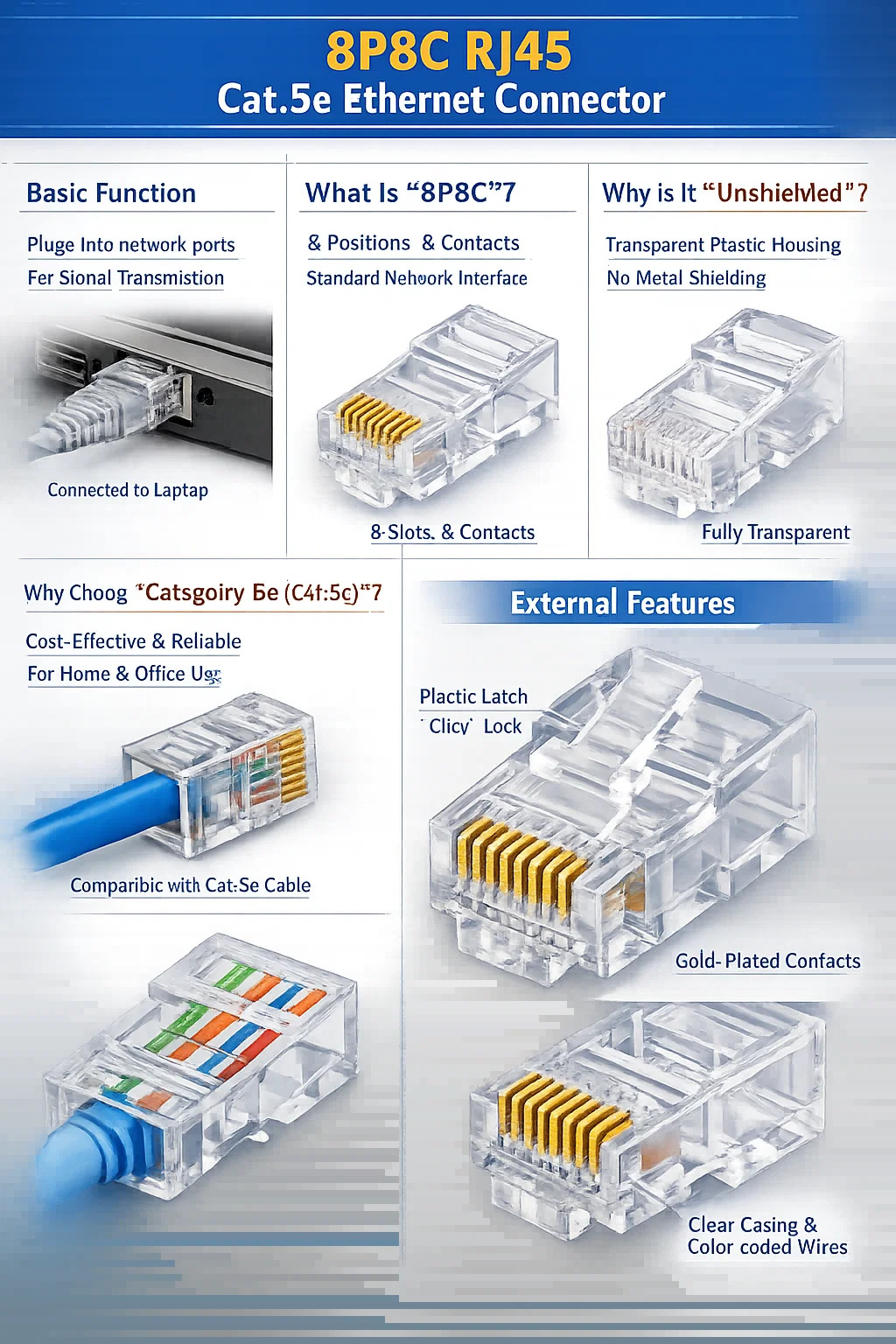 8개의 위치, 8개의 접점: "8P"는 전선 배치를 위한 8개의 슬롯이 있음을 의미하고 "8C"는 전기 전도를 위한 8개의 금속 접점이 있음을 의미합니다.